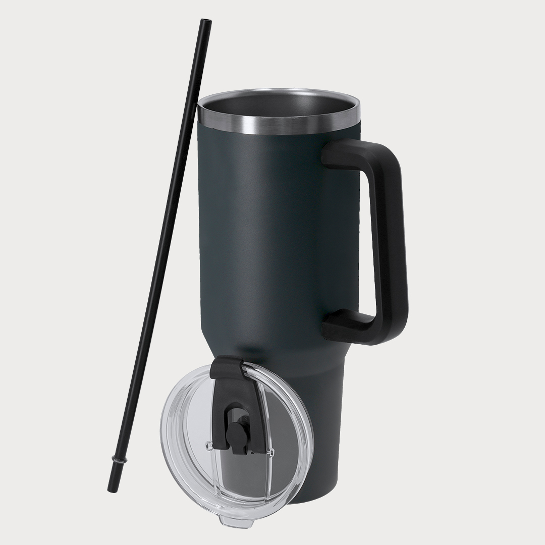 Thermobecher mit 1,2 L Fassungsvermögen, hergestellt aus recyceltem Edelstahl. Mit ergonomischem PP-Tragegriff für mehr Tragekomfort.