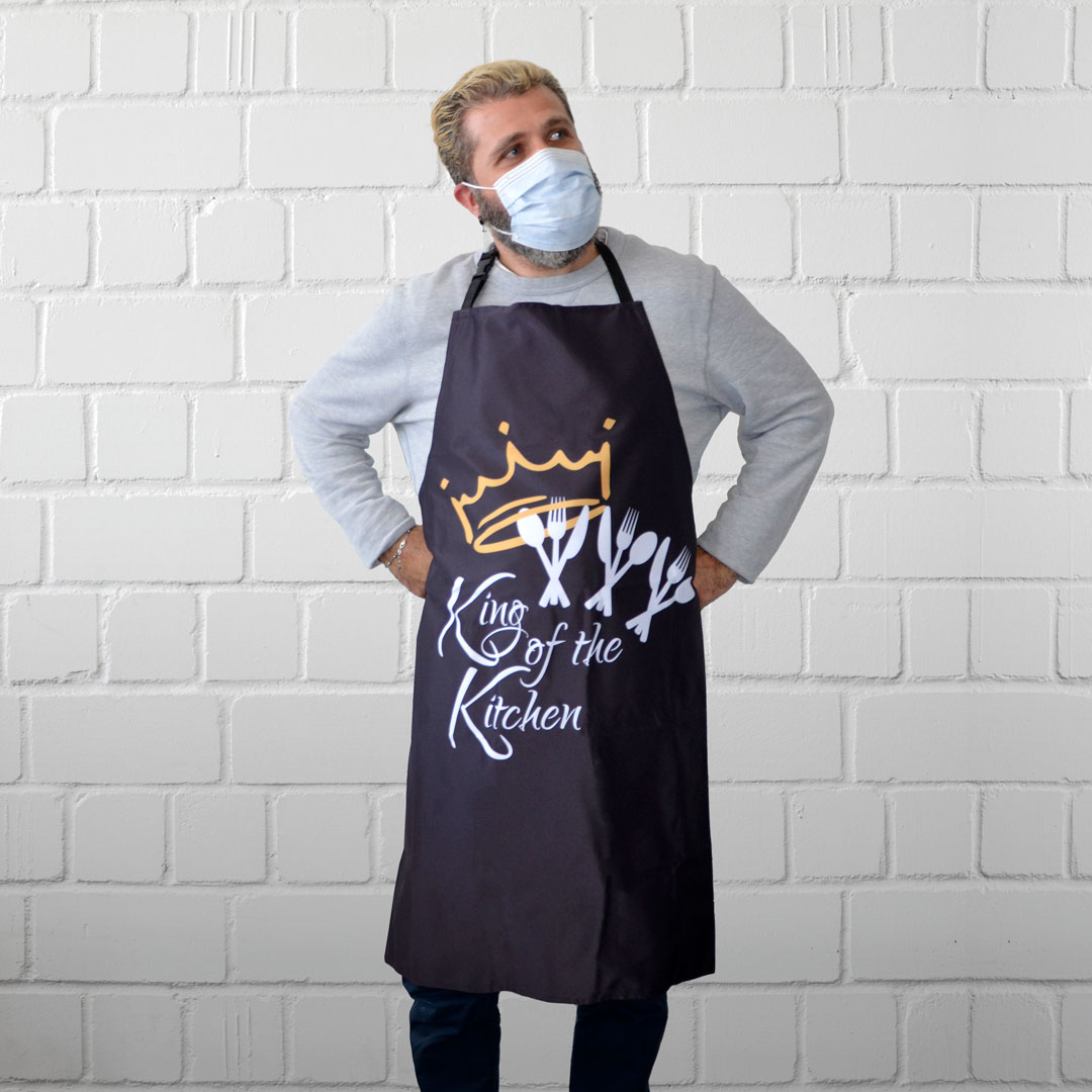 Die Schürze wird gebrauchsfertig konfektioniert, mit gesäumten Außenkanten, Nackenband, verstellbarem Kunststoffschließer und zwei Bändern zum hinten oder vorne Verknoten.